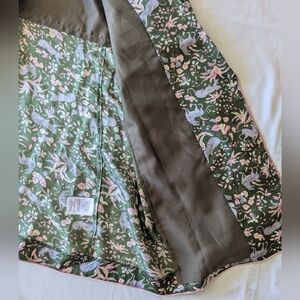 100% silk blazer from J. Crew Collection with jungle cat print in green, pink and gray. Size medium. Pockets. Loops for belt (but NO belt included). Gorgeous piece. J. Crew made matching pants and shirts as well (I don't have them, but I have seen them available on Poshmark from other sellers).