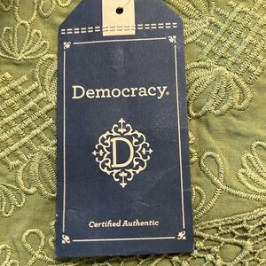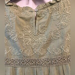 Chic olive green top with intricate embroidery. Features pleated cap sleeves. Perfect for casual wear.