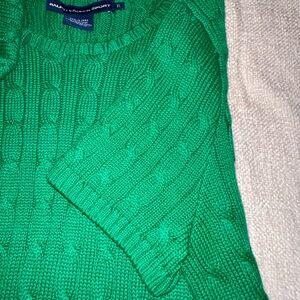 Vintage, Classic Ralph Lauren Sport cable knit sweater in a vibrant emerald / kelly green. 100% cotton. Features the iconic embroidered polo pony logo on the chest and an all-over textured cable knit pattern for timeless, preppy style.
