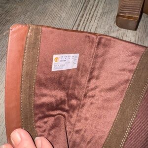 Design: The boots have a knee-high shaft, an almond toe shape, and a block heel of approximately 3 to 3.5 inches.