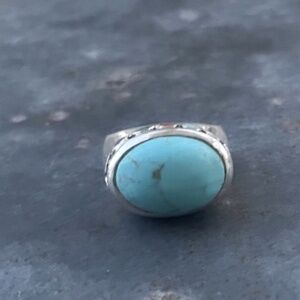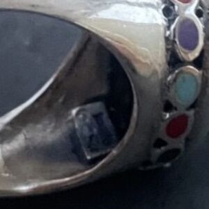 This is a beautiful sterling silver ring with a large turquoise stone, and turquoise, red and black colors around the center stone (not sure if those are enamel or stones). The ring is size 8 and is stamped 925 Thailand.