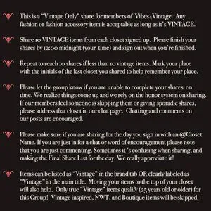🍎 Help spread the Vibes! Please add one of our “Just Vintage Share” banners to your closet! (If you haven’t already) Vibes4Vintage is looking for 1 or 2 new hosts for our daily share groups! If interested please leave your comment here or on chat page.