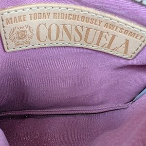 Consuela Nyla Combi black twilight toned star glitter exterior. Diego leather five-slot card wallet with D-ring. Removable black and blue glitter wristlet. Trimmed in natural, untreated leather. Made in Mexico