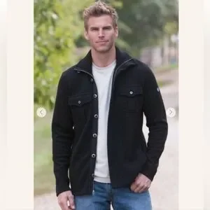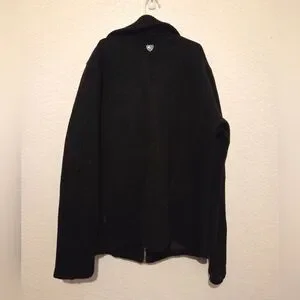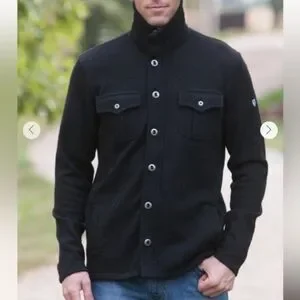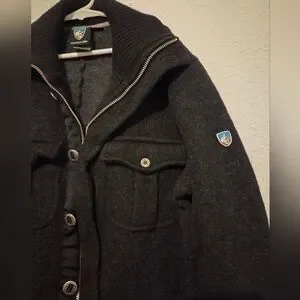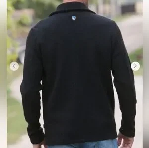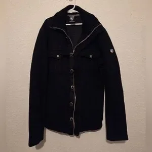 Kuhl Black Spy Merino Wool Sweater Jacket. Sleek and stvlish. Crafted from double-plated. Merino wool. Breathable and versatile. Keeps you insulated in chilly days, yet cool and dry in warmer weather. Full front zipper close under a 6 signature button placket. High ribbed collar. 2 slip hand pockets. 2 button-flap chest pockets. Kuhl logo patch to left upper arm and the upper back.