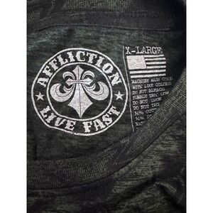 Affliction men's short-sleeve t-shirt in extra large. This black and green graphic tee features the "Live Fast" slogan with a skull and sniper rifle design on the back. The front showcases the Affliction "Live Fast" circular logo. Ideal for casual outings, concerts, or everyday wear.