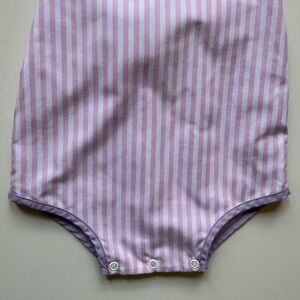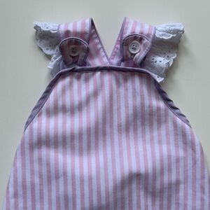 Adorable pink and white striped baby romper with lace strap details & lavender trim. Perfect for a cute and comfy look.