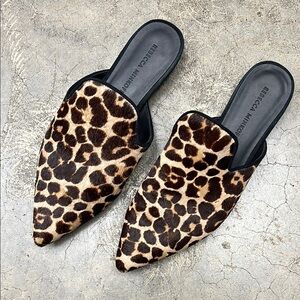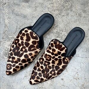 These Rebecca Minkoff mules feature a striking leopard print on a soft, suede-like upper, complemented by a sleek black sole. The pointed toe design adds a modern touch, while the backless style ensures easy slip-on wear.