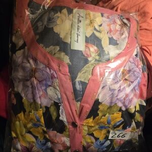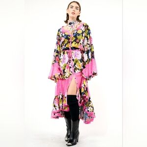 Charming dress with vibrant floral patterns. Features a pink trim and button detail.