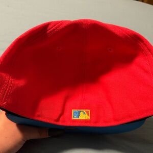 Stylish red cap featuring a blue LA logo. Includes unique patches and pin. Never worn like new