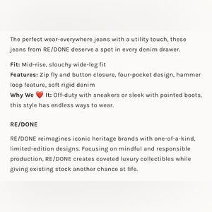 Re/Done oversized wide leg ‘Painter’ jeans in Black size 25. These run big! I’m usually a 25-26 and there are a bit big on me. I would recommend buying if you’re a 26-27. They are also very long and require wearing heels if you’re my height (5’7).