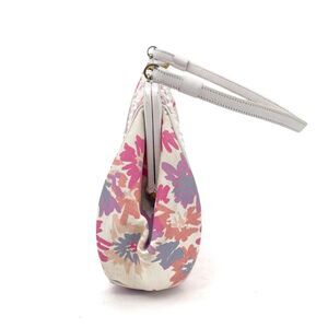 Charming vintage 1960s Magid floral clutch handbag featuring a vibrant pink, purple, and peach daisy print on a white fabric background. Embellished with intricate white beading and seed beads for added texture and elegance. Includes a matching attached mini coin purse on a dainty gold-tone chain inside. Kiss-lock closure and white faux leather handle for easy carrying. Fully lined interior with a slip pocket. Perfect for garden parties, bridal showers, or cottagecore and romantic looks.