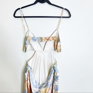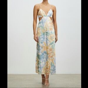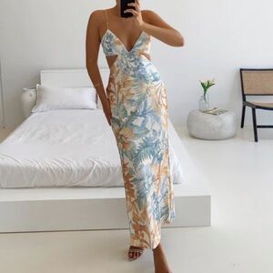 Elegant maxi dress with floral print. Features blue and orange hues. Spaghetti straps and cut-out details. Perfect for summer occasions.
