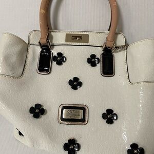 Guess purse so cute cream with black flowers, black flower keychain adorable but very well worn on the handles but clean inside Guess handbag. Ivory With Black Flowers.. The handbag is in great condition with the exception of the handles. They are flaking and need to be replaced. These can easily be cut off and replaced with any type of handles you like. They are available on Amazon and many other places online.