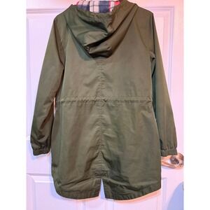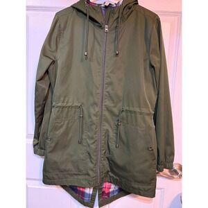Keywords: anorak jacket, hooded jacket, drawstring jacket, olive green, plaid lining, womens jacket, casual jacket, lightweight jacket, fall outerwear, spring outerwear, Time and Tru, pockets, outdoor jacket, travel jacket