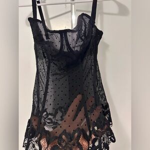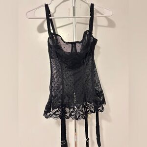 Elegant black sheer lace corset top with polka dot design. Features delicate lace trim and adjustable strap with garters.