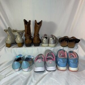 A collection of kids shoes featuring various styles and colors. Includes glittery boots, brown boots, pink sneakers, and more.