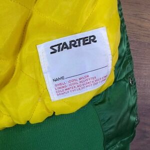 Condition: Good vintage condition. This is an extremely rare 1970s Minnesota North Stars insulated satin jacket. Features classic green satin shell with yellow quilted lining, snap button front, ribbed cuffs and hem, and iconic North Stars "N" star logo on the chest. Official NHL license by Starter. Light general wear consistent with age, no major flaws noted. A true collector-level vintage piece.
