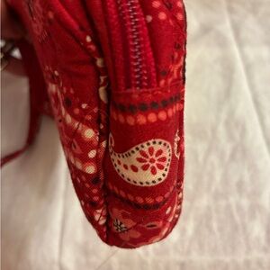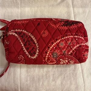 7”x 4”. Stylish and vibrant, this Vera Bradley wristlet features a striking red paisley design. Perfect for adding a pop of color to any outfit.