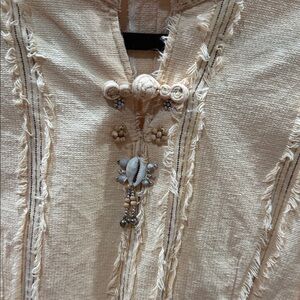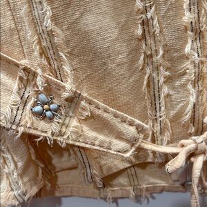 Stylish tan blouse with unique embellishments. Features frayed edges and a tie waist. Ideal for any occasion.
