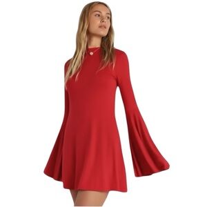 free people dress, dare to dance dress, free people mini dress, red mini dress, bell sleeve dress, long sleeve mini, fit and flare dress, party dress, holiday dress, night out dress, boho mini dress, statement sleeve dress, nwot free people, size medium dress, women’s mini dress