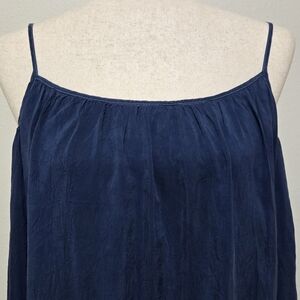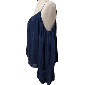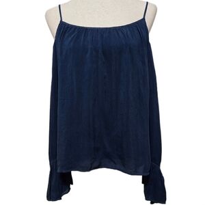 Effortlessly chic and incredibly soft, this Maven West blouse is a wardrobe essential. This navy blue blouse has a relaxed silhouette with delicate spaghetti straps and trendy cold-shoulder cutouts. The long sleeves are finished with dramatic ruffled bell cuffs that add a touch of bohemian flair. The top is also lined along the body. Crafted from a lightweight fabric with a subtle washed texture, this top offers a beautiful drape and ultimate comfort.