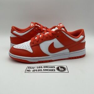 The Nike Dunk Low Cosmic Clay in size 9.5 is a stylish and trendy athletic shoe designed for men. Featuring a low-top silhouette and a vibrant orange color, this sneaker is part of the Nike Dunk product line, known for its quality and style. With a leather upper material and the signature Nike branding, this shoe is sure to make a statement and provide comfort and support for all-day wear.