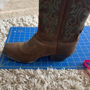 Justin Boots womens brown leather cowboy boots. These boots feature intricate turquoise and gold stitching on the shaft and vamp, a comfortable square toe, and a classic pull-on design with decorative stitching on the sides. Perfect for equestrian events, country concerts, or adding a touch of Western flair to everyday outfits.