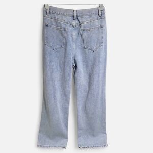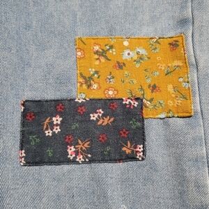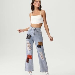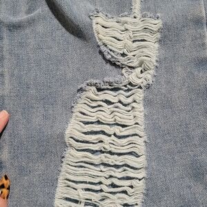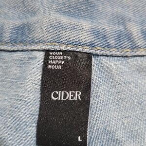 The product is a pair of Cider distressed boyfriend denim jeans in a size large (L). These boho-inspired jeans feature a patchwork design and are made of blue denim fabric. The boyfriend style offers a relaxed fit, perfect for a casual and trendy look. The distressed detailing adds a touch of edginess to the bohemian theme, making it a versatile and stylish addition to any woman's wardrobe. Pre-owned in EUC.