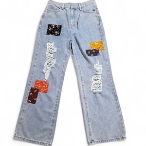 Cider Patchwork Distressed Boyfriend Denim Jeans Size L 15/29 Blue Boho