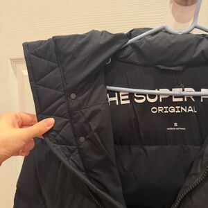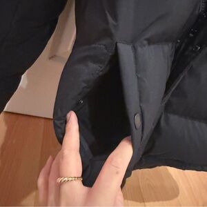 Stylish black puffer jacket with a hood. Perfect for cold weather. Regular length; not the shorty! Selling bc I bought another one and don’t wear this one anymore.