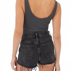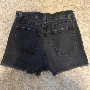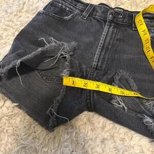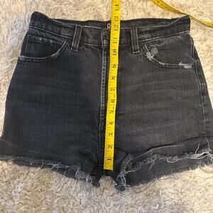 Washed black BDG denim shorts with a raw frayed hem and subtle distressing. High-rise, super flattering, and comfy. Good condition.