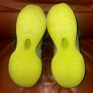 Stylish gray and green sneakers with unique design.