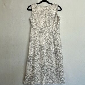 Keywords: J. McLaughlin, sheath dress, sleeveless dress, gray dress, white dress, abstract print, cocktail dress, business dress, lined dress, size S, career wear, office wear, womens dress, career dress