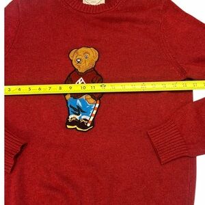 Classic red crewneck sweater. Features a playful bear design.