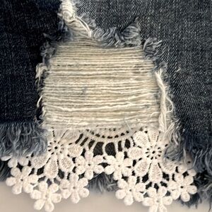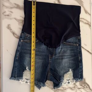 Five Pocket Maternity distressed soft denim short with a medium blue wash. White lace floral insert, high waist maternity panel for all day comfort. Size L NWOT