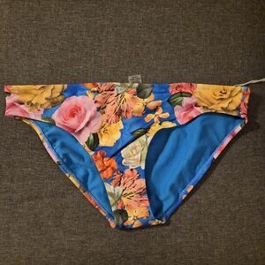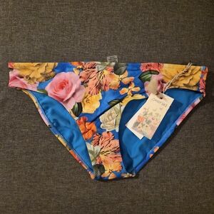 Vibrant floral bikini bottoms with a blue base. Features pink, yellow, and orange flowers.