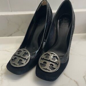Tory Burch Signature Logo Suede Pumps with Faux Snakeskin Effect Patent Leather Trim - Size 8