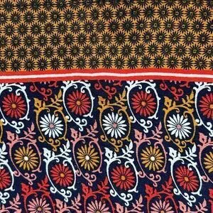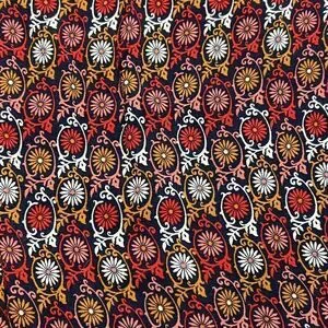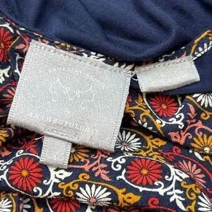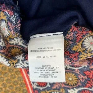 The Anthropologie Vanessa Virginia Printed Sleeveless Blouse in Women's Large is a stylish and feminine top. The blouse features a beautiful floral print in shades of pink, red, and white on a navy blue background. The sleeveless design makes it perfect for warmer weather, while the loose fit and flowy style make it comfortable to wear all day long. The neckline has a subtle high neck with delicate pleated trim that adds a hint of elegance to the top. The blouse is made of a lightweight, breathable fabric that drapes beautifully over the body. Overall, it is a lovely and versatile piece that can be dressed up or down depending on the occasion.