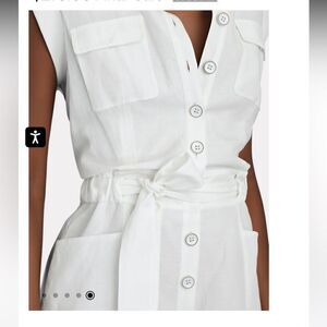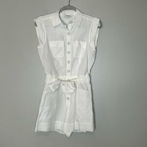 Tied along the waist with a matching tie belt, our Juliet romper is an one-and-done summer staple in a crisp white blended linen. Pointed collar. Button front closures. Front flap and side slash pockets.