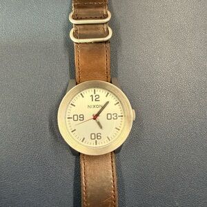 Stylish Nixon watch with a silver dial. Features a brown Horween leather strap. 48mm case, 12mm thick.