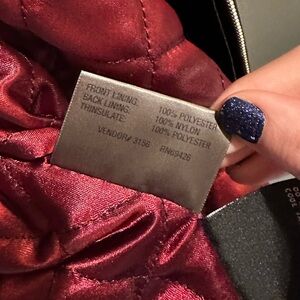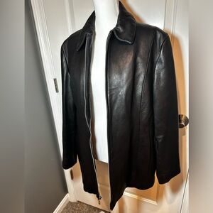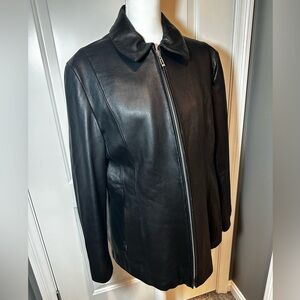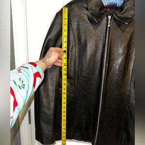 This is a black genuine leather jacket by Wilsons Leather! Wonderful condition. The only thing i would comment on are these markings on the shoulder I took an up close picture of. I wouldn’t even know how to describe it or what they are,I just see it and it’s there. Lol. So see pics. Otherwise wonderful