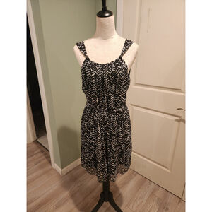 New, never worn without tags Burberry Brit Dress. This dress is black with a light gray pattern and thin string tie belt. Dress is size 10 and 100% silk. Scoop neck front with v-plunge back and knee length. Has a side zipper in the center left side of the dress.