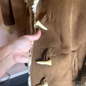 Cozy faux shearling coat. Brown exterior with cream lining. Toggle closures. Perfect for cold weather.