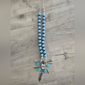 Ox Cow Skull Dangle Feathers Necklace Silver Blue/Black Beads Western Cowgirl