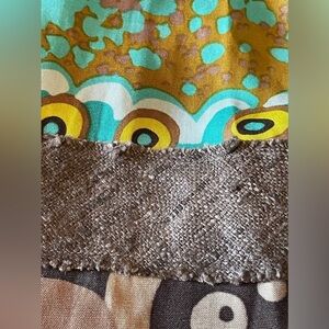 Bright, retro colors and vibe. Wide sleeves (but not quite dolman sleeves). Button closure inside jacket. Solid brown edging has natural pills. Great with jeans, skirt, trousers. Self tie drawstring at waist (inside brown banding) is missing.