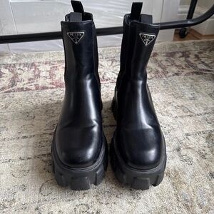 Elegant Prada boots with a chunky heel. Sleek black leather design. Ideal for a bold statement.