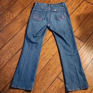 Nice pair of blue denim jeans by Lee. Curvy fit just below the waist. 30" waist, 28" inseam
