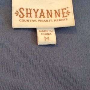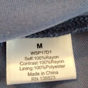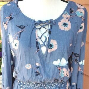 Very country. Denim blue crinkly floral with contrasting waistband and trim at hem. Lace up front neckline. Blouson bodice, long, bell shaped sleeves. Elastic shirred waistband in tiny floral. Full skirt, fully lined, pull over. Gathered ruffle at bottom. Washable . Size M measures 44 at chest, 26-44 at shirred waist, ( designed to be loose) full skirt. 37 long from shoulder to hem. Perfect with sandals or cowboy boots.Motto: Country. Wear it. Mean it.