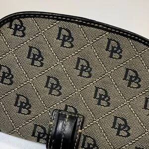 Stylish crossbody bag with iconic logo pattern. Features a sleek black trim and elegant beige background. Perfect for everyday use.