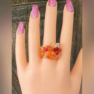 Orange Quartz Stone Handmade Seed Bead and Stone Chips Stretch Ring
